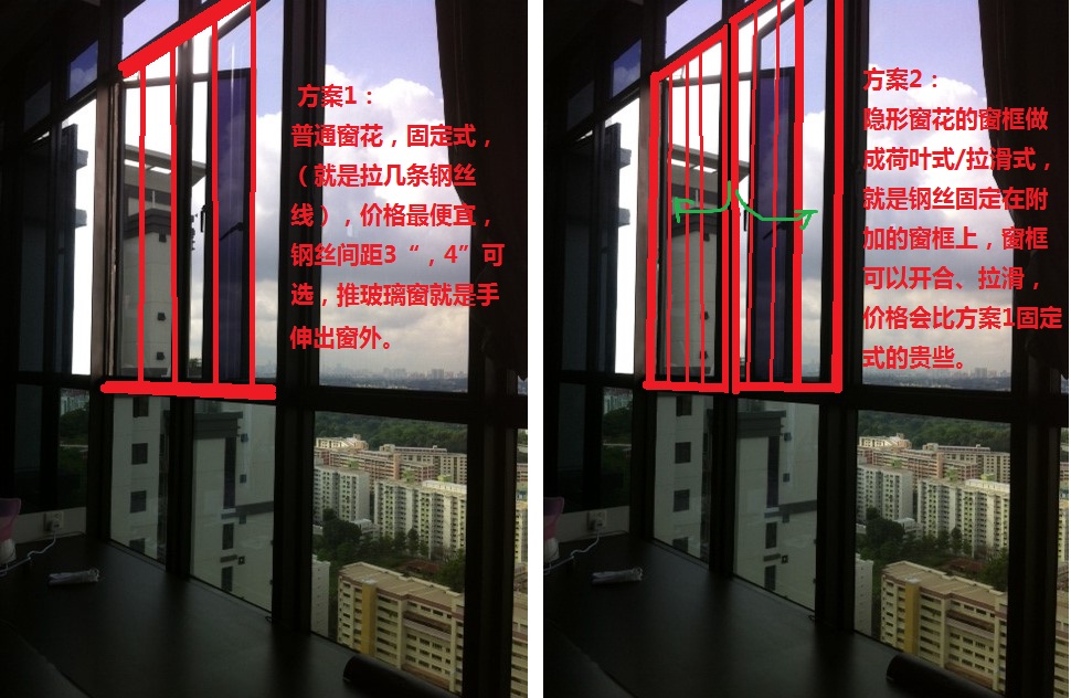 我们夫妻俩是一致不喜欢传统窗花,认为会把组屋直接降格到“ 牢房”。买房5年都没考虑装,实在是老二太调皮,才开始做功课。