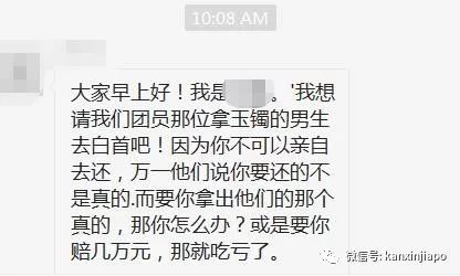 旅行社要求新加坡夫妇把手镯归还。他们认错就OK。