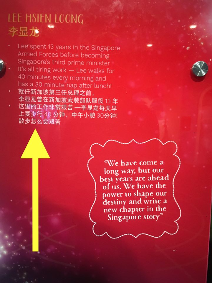 電動發光膠囊 • • 40353 次浏览李显龙蜡像官方介绍:「李显龙曾在新加坡武装部队服役13年,这里的工作非常艰苦--李显龙每天早上要步行40分钟,中午小憩30分钟!」然后,有一句英文版没有的话:「散步怎么会艰苦」。似乎,是工作人员内部准备时的评语,不小心原封不动被列印出来了......也许过不了多久,就没有了这句多余的话。