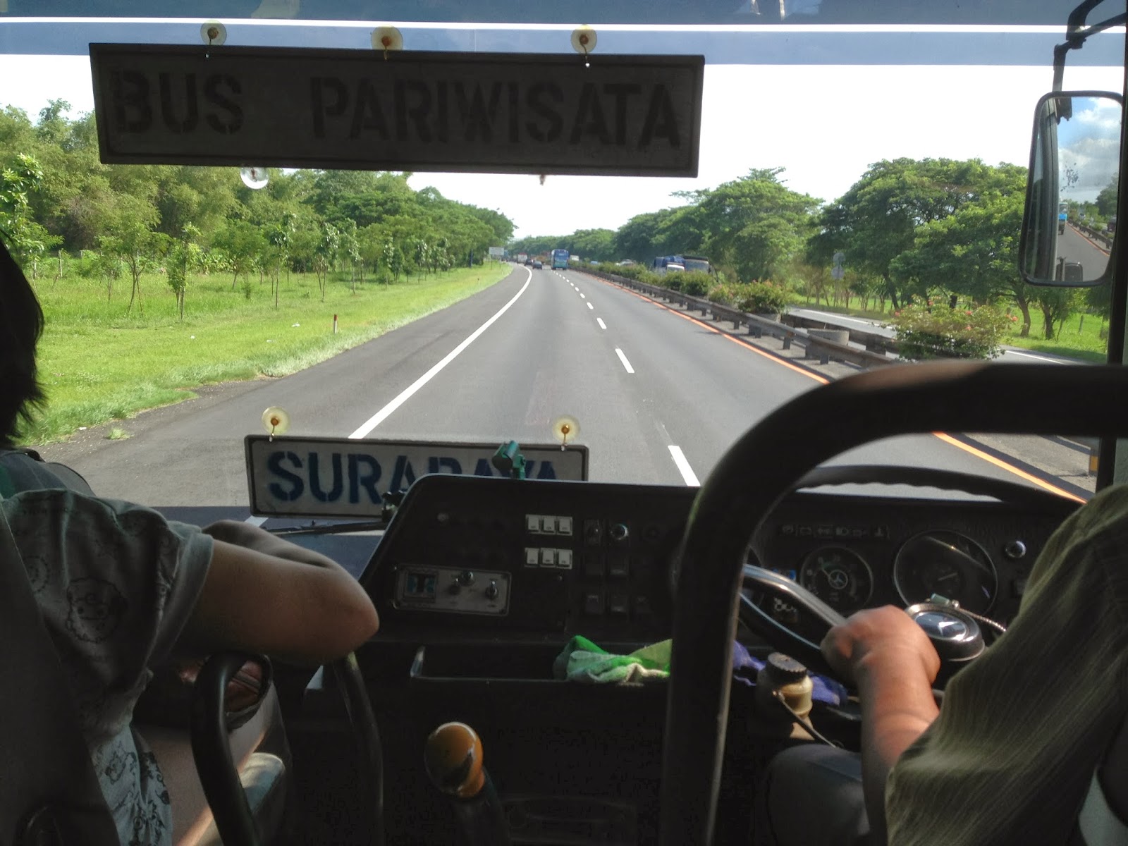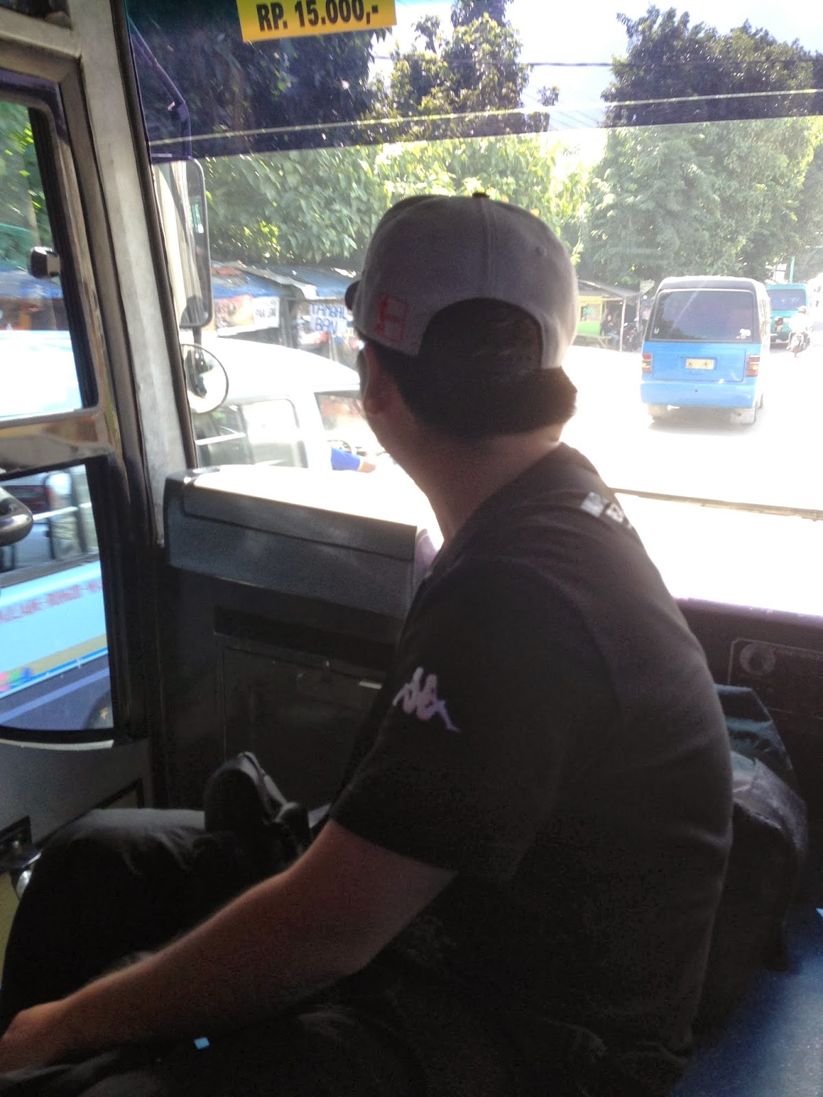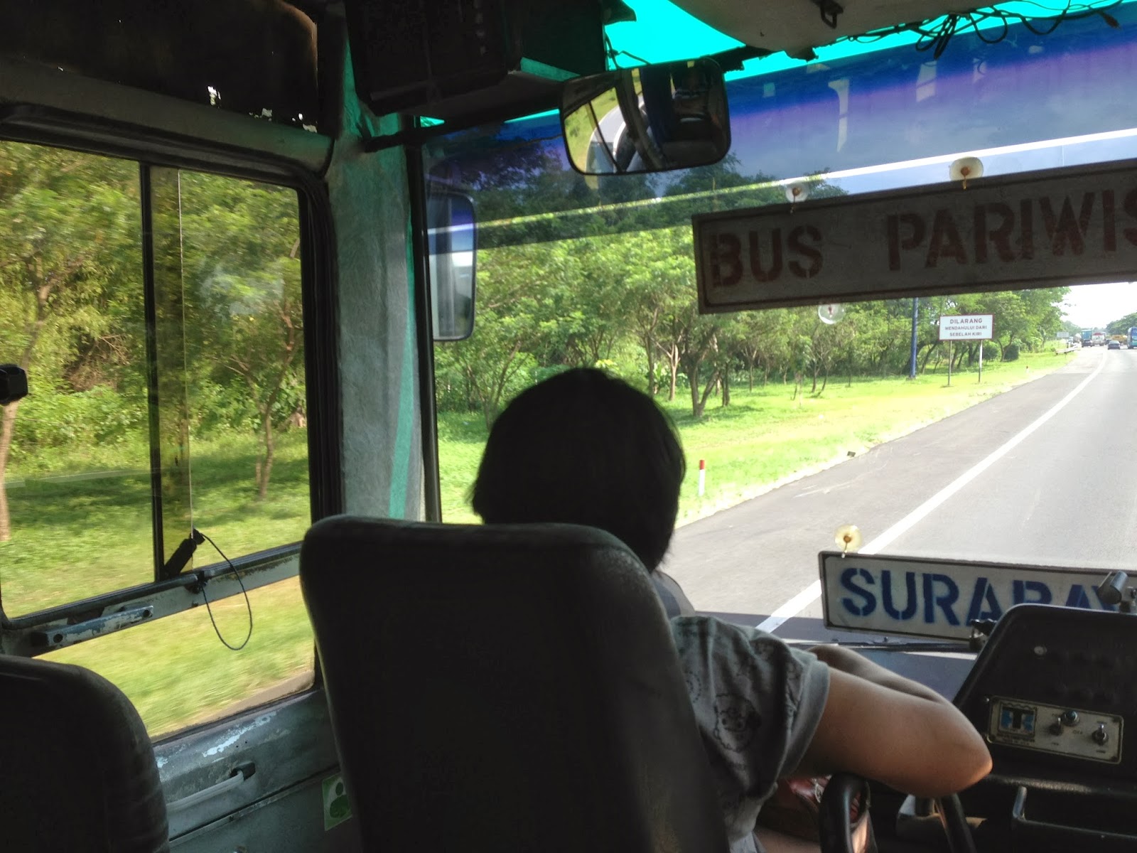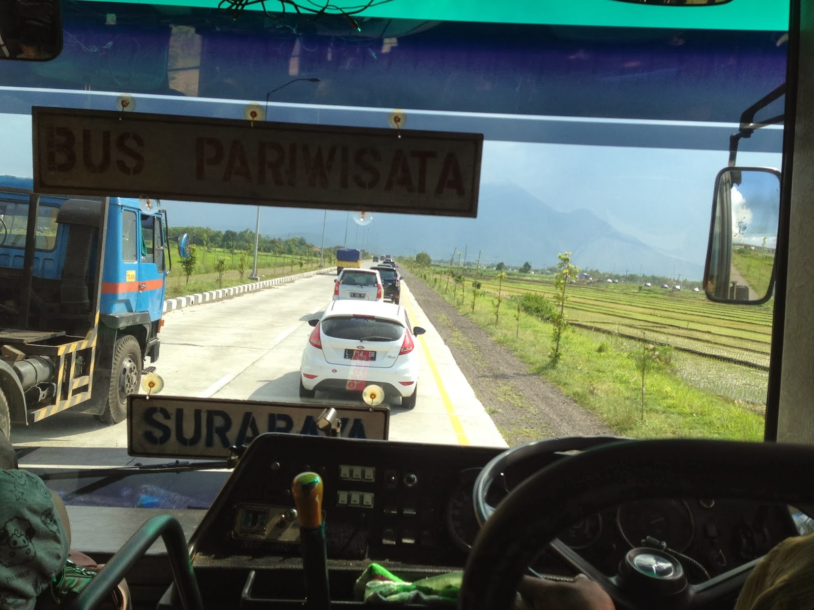 从机场去到bromo山脚下还需要差不多一个半到两个小时的车程,当然,我们肯定不是taxi或者包车去的,虽然在去汽车站的路上遇到一大堆要载我们上去的taxi,我也随口问了下价格,简直就是狮子大开口,跟我做的攻略上差不知道有多少倍,我们理都懒得理他们,然后就上了一辆大巴士,如同事所说,印尼的巴士都是开开停停,经常有人上来叫卖东西。但是总体来说印尼人民给人的感觉还是不错的,除了在上车的时候猪猪说被人家吃豆腐了哈哈哈哈哈