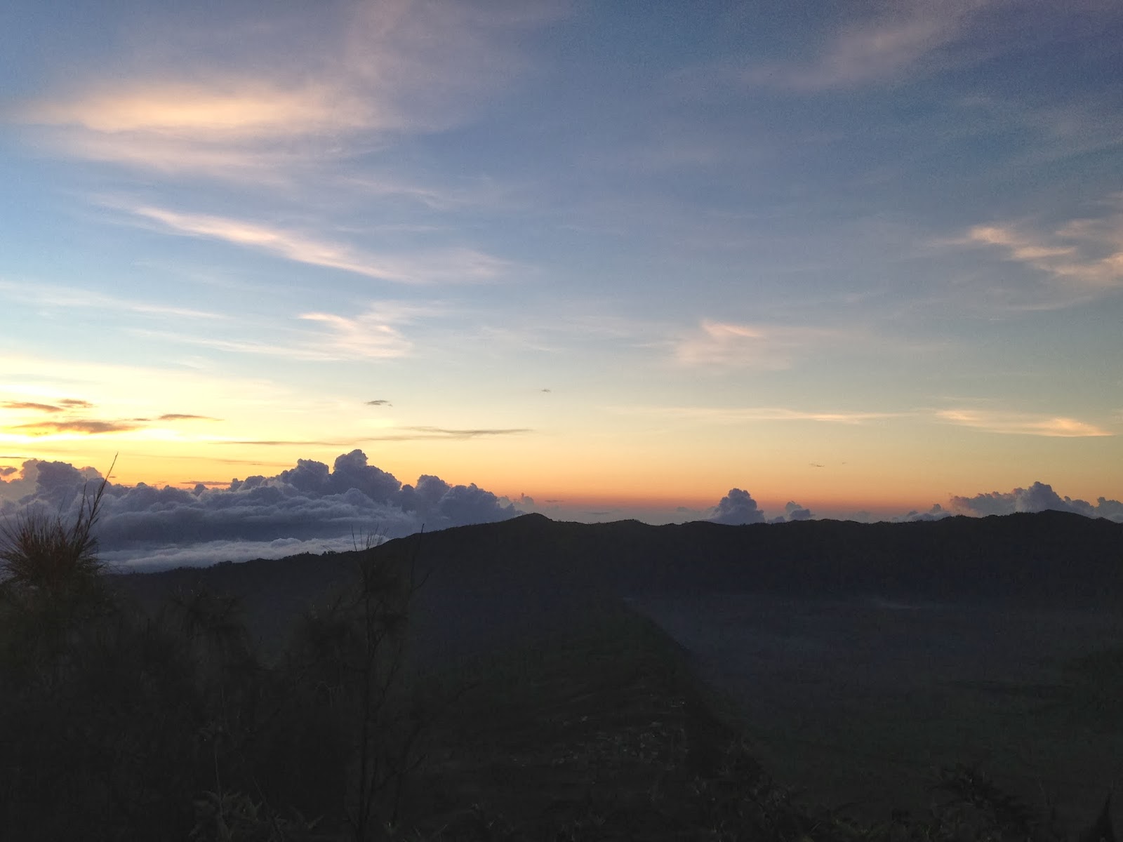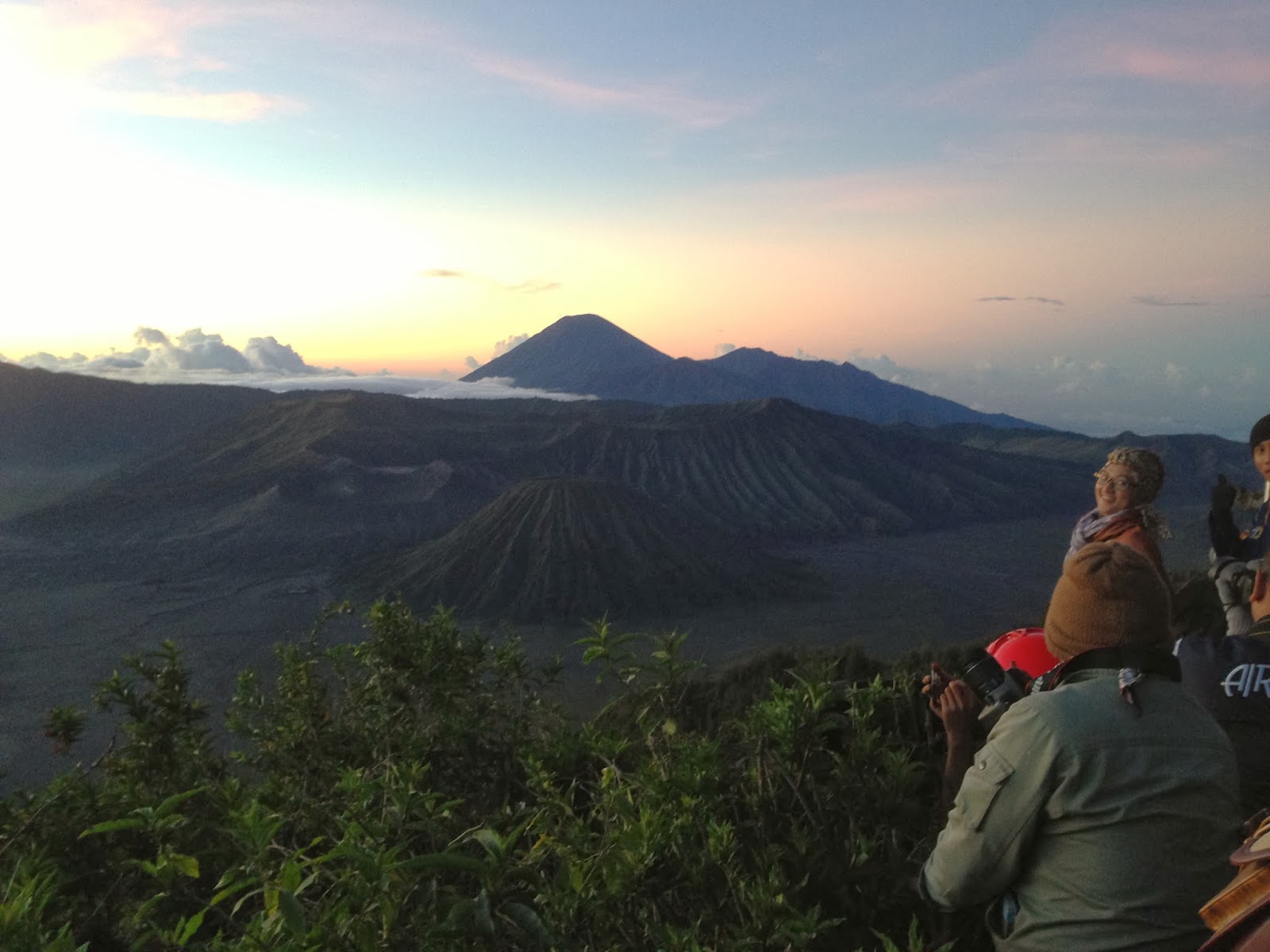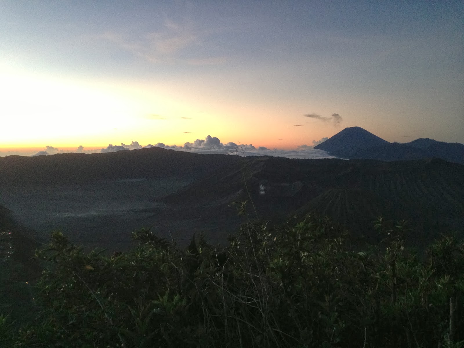 从机场去到bromo山脚下还需要差不多一个半到两个小时的车程,当然,我们肯定不是taxi或者包车去的,虽然在去汽车站的路上遇到一大堆要载我们上去的taxi,我也随口问了下价格,简直就是狮子大开口,跟我做的攻略上差不知道有多少倍,我们理都懒得理他们,然后就上了一辆大巴士,如同事所说,印尼的巴士都是开开停停,经常有人上来叫卖东西。但是总体来说印尼人民给人的感觉还是不错的,除了在上车的时候猪猪说被人家吃豆腐了哈哈哈哈哈