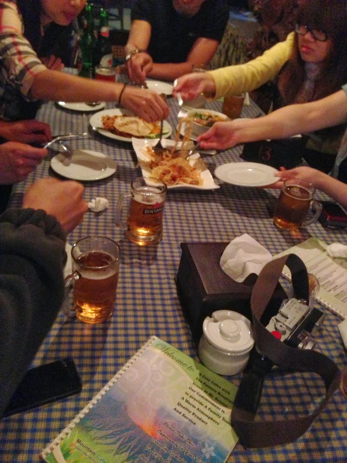 下了巴士后我们又换乘了另外一辆私人的小巴才一直盘山上去,又是一个小时那,等到了山上都一个小时了,酒店我已经在网上订好了,找了好久终于找到。。。。山上的温度冻得我们要死。。。。也就因为这温度。。。山上到处都是卖帽子手套围巾的。。。。一辆车上去一停下就有几十个卖同样东西的人围过来,瞬间你就喘不过去。。。。各种各样颜色款式的围巾,如果你不想买,在的一瞬间不跑掉。。。那真的该挖个地洞逃出去了,因为我们带的衣服也只是一件外套,这温度当然比云顶上要冷的多,加上是晚上,最后我们决定每人选一条围巾,死命砍价之后,每个人在万花丛中终于挑了一条陪伴我们一天一夜的围巾。。。在岛国久了,都不知道围围巾是啥感觉了,围上围巾后的感觉真的太美妙了,瞬间心里都温暖了。。。。