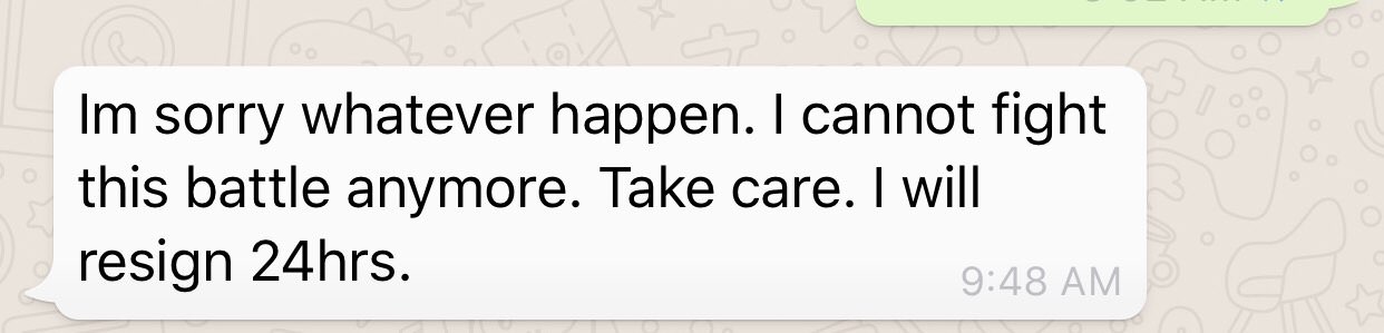 附上她的辞职inform就这样拿着包10点半从site回家了。。。。然后打电话不接,sendSMS不回复也不读。。。。接下来的一周五天mc 。