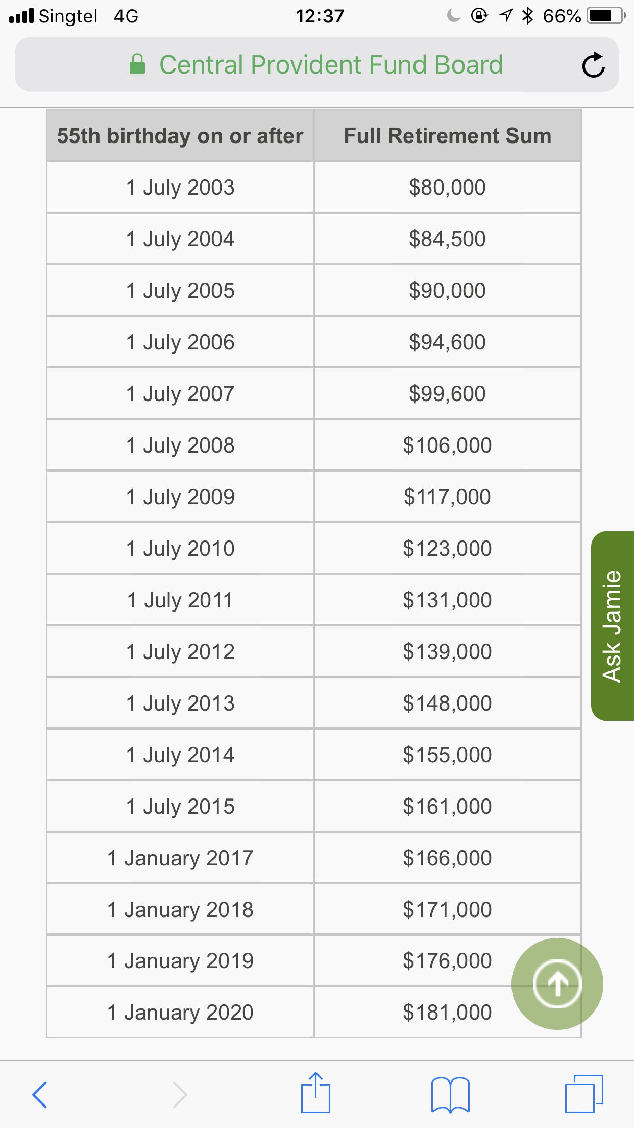sa+oa的总数超过政府规定的full retirement sum的部分可以在55岁之后取现金出来。下图是历年的full retirement sum,年年涨,最近几年一年涨5000。可以大概估一下55岁的时候这个frs涨到多少了。