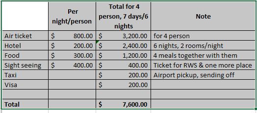 刚做了个预算,中规中矩估计得8000 SGD, 这钱花的有点肉疼,关键这钱现在花了,以后其他亲戚来不这么招待的话又怕生矛盾。。。