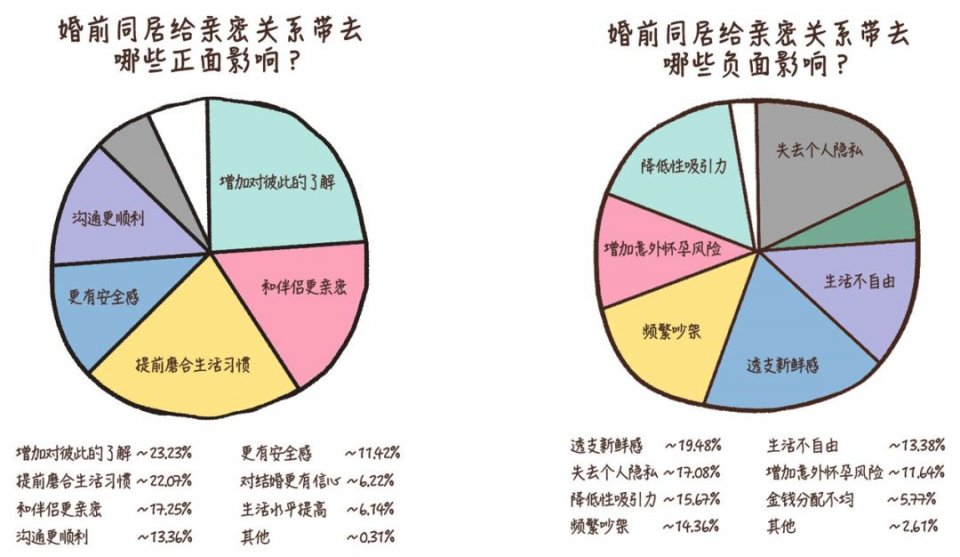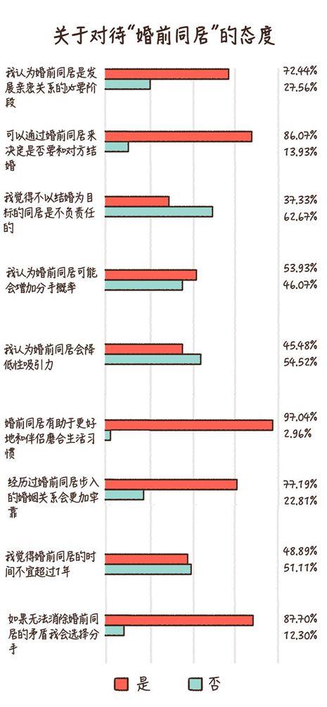 他们中部分人觉得婚前应该同居,但是内心对于每天一睁眼就看到伴侣的生活感到害怕;一位已经同居近1年的朋友感叹说,住到一起后三天一小吵五天一大吵的噩梦让人身心俱疲、无所适从,建议千万不要做自掘坟墓的事。
