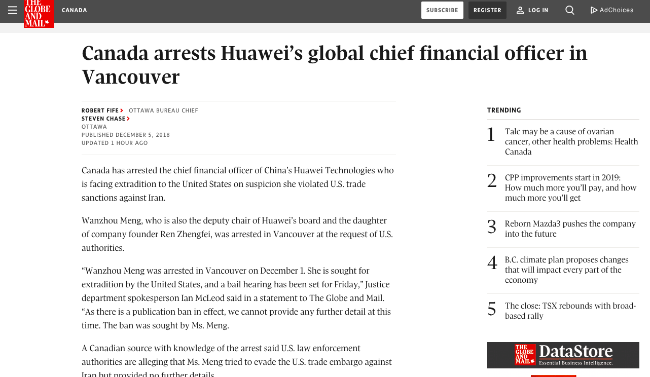 与此同时,据加拿大《环球邮报》报道,华为公司创始人任正非之女、CFO孟晚舟已被加拿大逮捕,面临被引渡到美国,原因是她涉嫌违反了美国对伊朗的制裁规定。