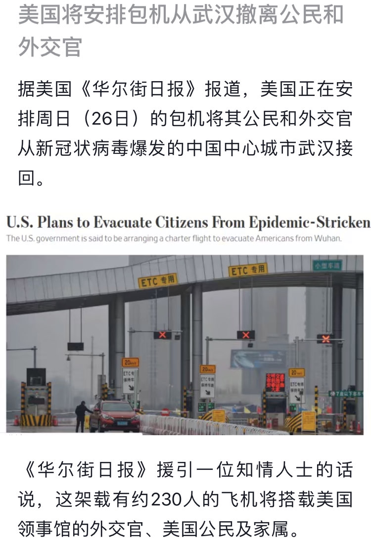 美国安排包机从武汉撤离公民了