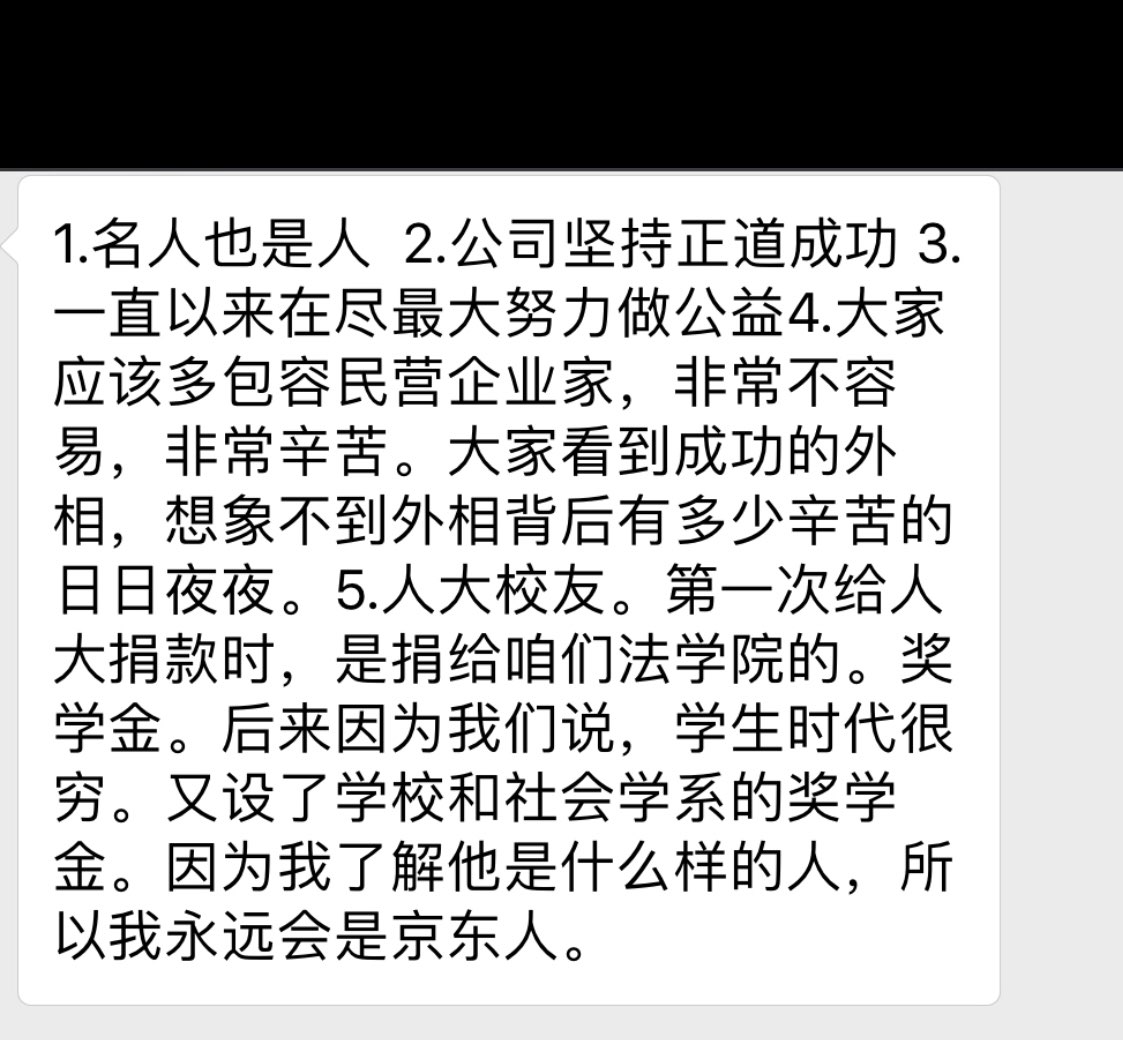 在这段煎熬的日子里,我特别感激京东的每一位同事,他们每天都在顶着舆论压力工作。我恳请大家不要由于我的事情再去苛责、议论他们,他们只是一群努力工作的普通年轻人。现在,我唯一能够为他们做的就是更加努力的投入到工作当中,和他们一起让公司发展的更好,让他们过上更好的生活。只有这样,才是我对他们最好的交代!