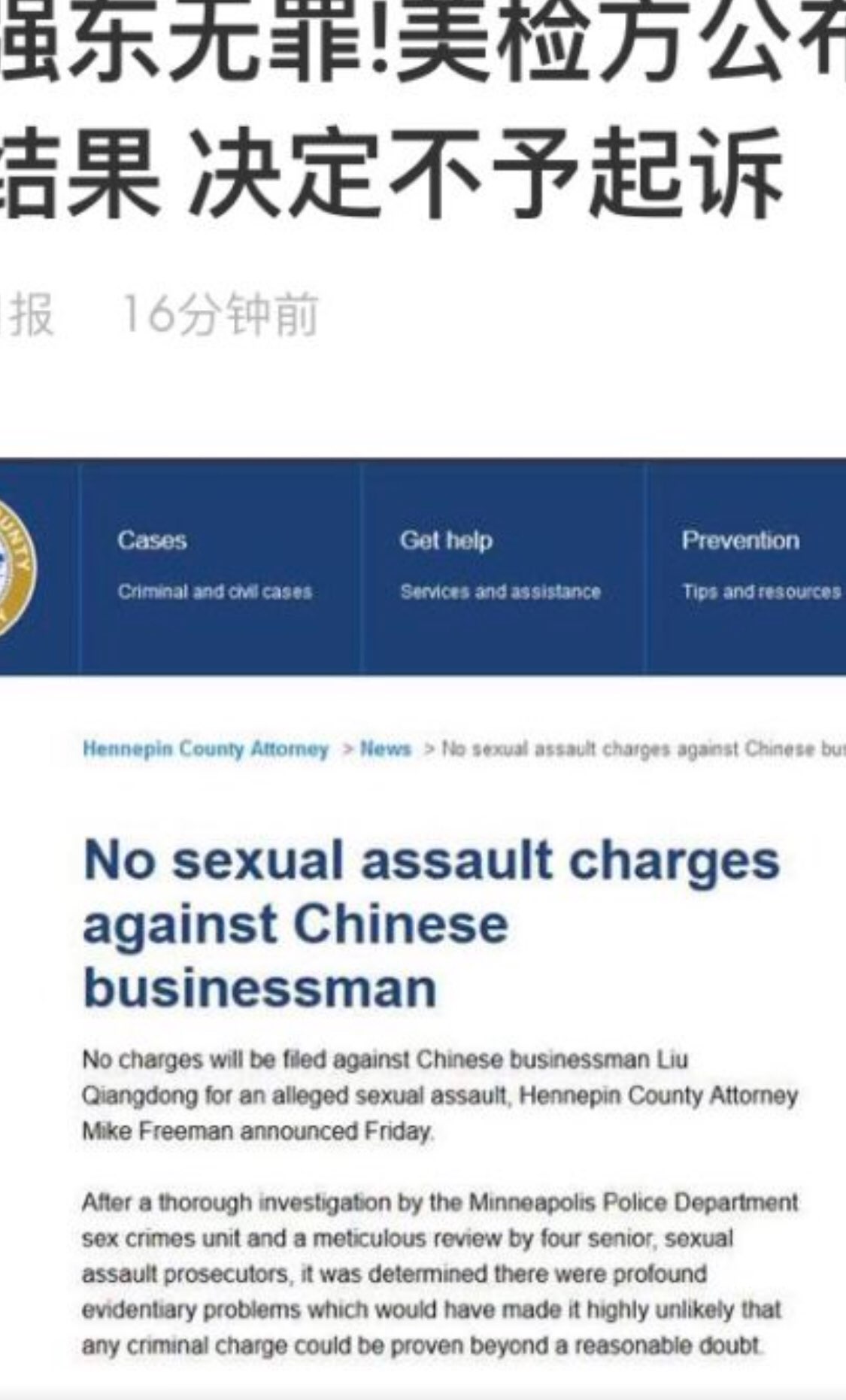 ZT 说说刘强东事件12月22日,美国明尼苏达州明尼阿波利斯市亨内平县检察官办公室公布刘强东事件的调查结果,决定不予起诉,这也意味着该案正式结案,刘强东无罪。
