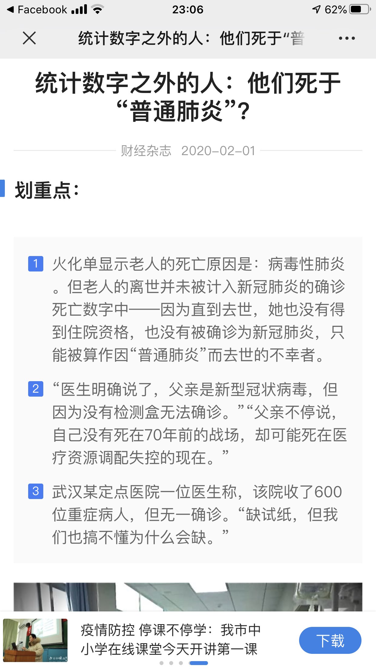假如中国政府压数字现在我们也知道了,WHO会根据疫病情况设立等级。如果数字很大可能中国已经被定为疫区了,这意味着跟国外的文化、旅游、贸易等各种方面全面阻断。看现在多国停航就知道什么情况了,往后严重的话中国商品也无法出口,就算有人想进口也必须经过严格复杂的第三方检疫,股市暴跌,大量失业都不可避免……那么多人已经病了,不能把生存所需也断了吧