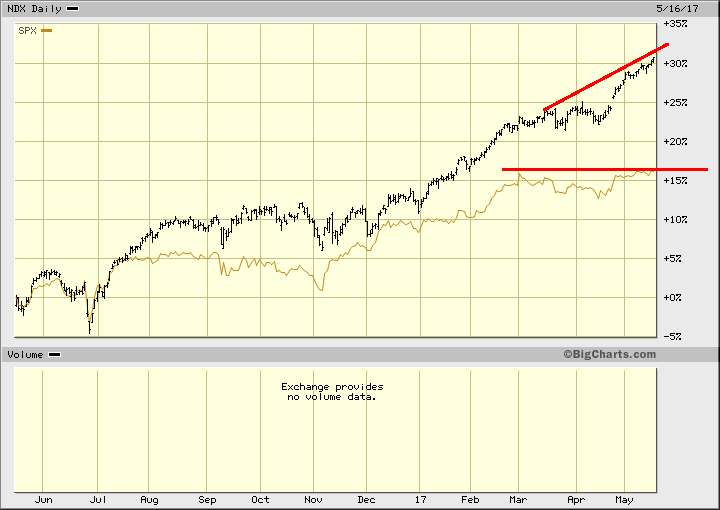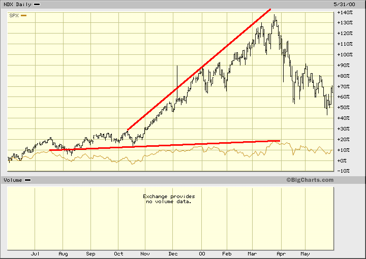 2. 大市早已停滞不前,仅有数只大科技股上升 (黑线:科技股,黄线:标普500)