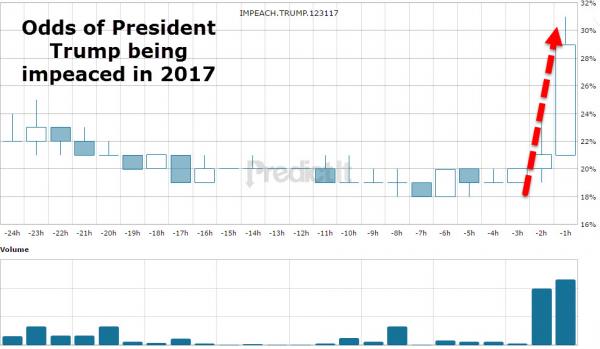 然而,人们已经开始为“特朗普通俄门”事件可能的糟糕结果做准备了。根据PredictIt网站,特朗普今年被弹劾的概率已翻了一倍,从19%飙升至29%。