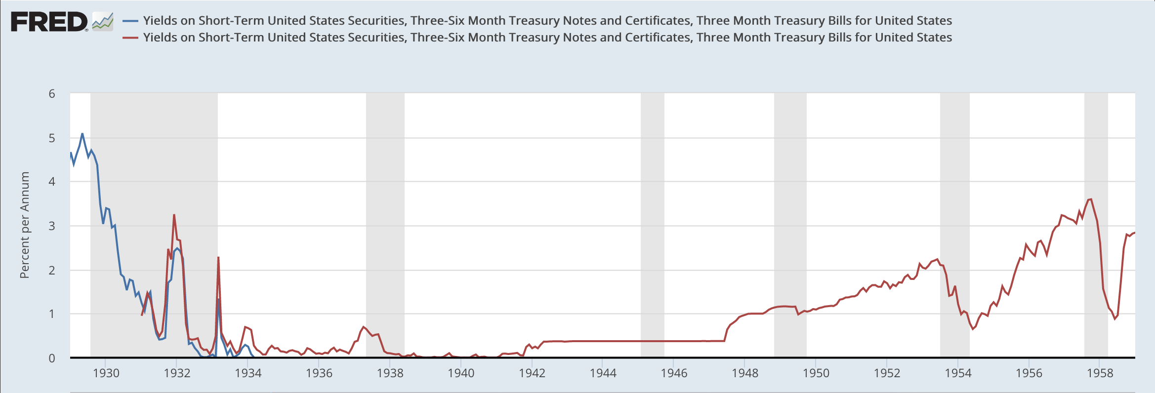美国利率走势1929年大萧条(great depression)中,美国利率在1932年跌至0. 经过10年(1942)和一次衰退(阴影),利率才和0说再见。经过16年(1948)和两次衰退,利率见到1。经过20年(1952)和三次衰退,利率见到2.