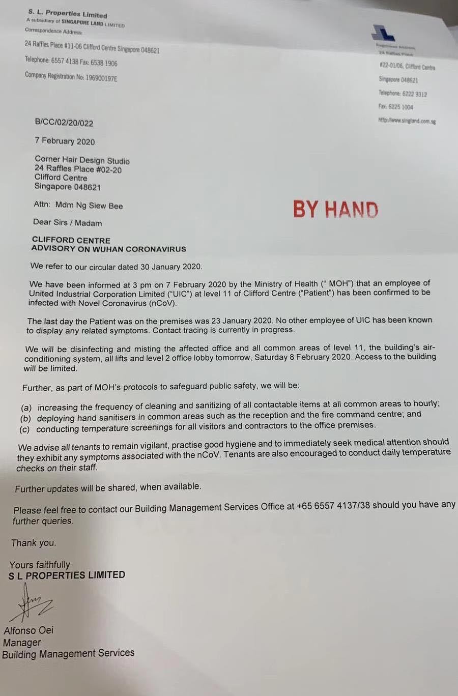 clifford center的像是第31例那封通知信是2月7号的,7号确诊的是31-33例,并且说最后一次去办公室是23号