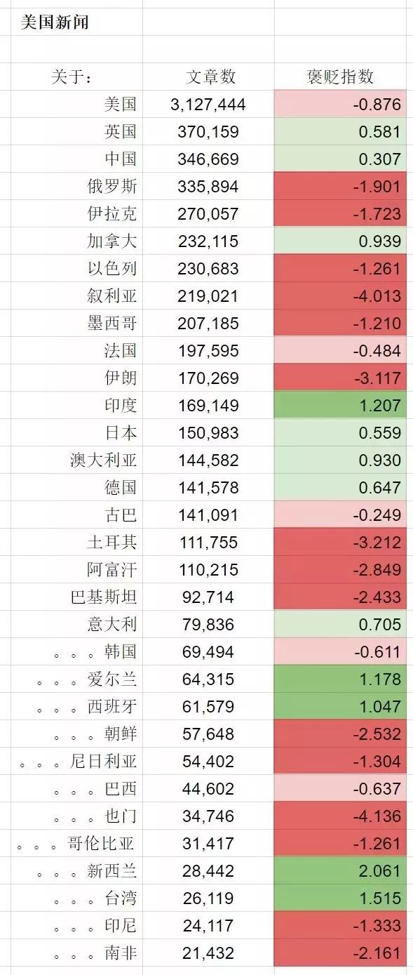 下面看美国媒体对不同国家和地区的褒贬指数: