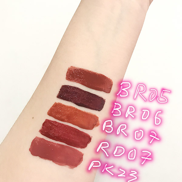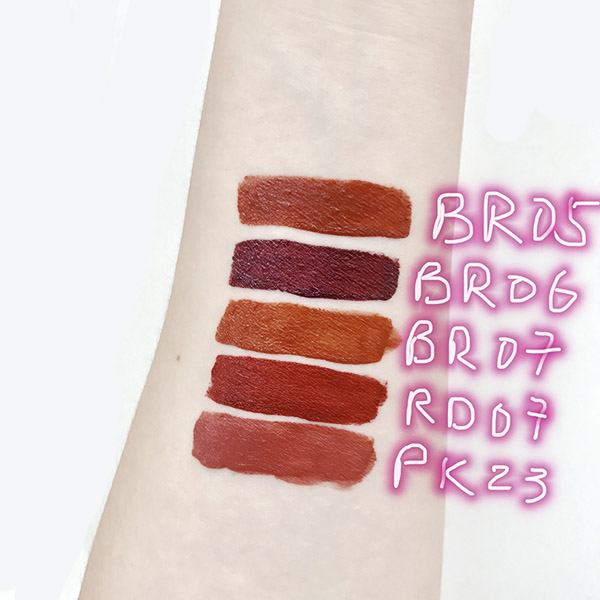 日光灯下拍的。RD07是非常不挑皮而且显手白的一个颜色!怎么擦都好看!摸良心推荐!如果只入一只的话强力推荐它! 然后BR05是非常标准的土色,百搭,想入土色系推荐这只。BR07土橘色也是很美哒,但是会挑皮!黄皮很不友好。PK23是粉嫩嫩的少女色,推荐给萌妹子们!BR06就是很神奇的一个色了,虽然BR棕色开头,但其实是很深的姨妈红……就女主黑化以后用的那个色……涂一层还是蛮好看两层直接变黑hold不住……