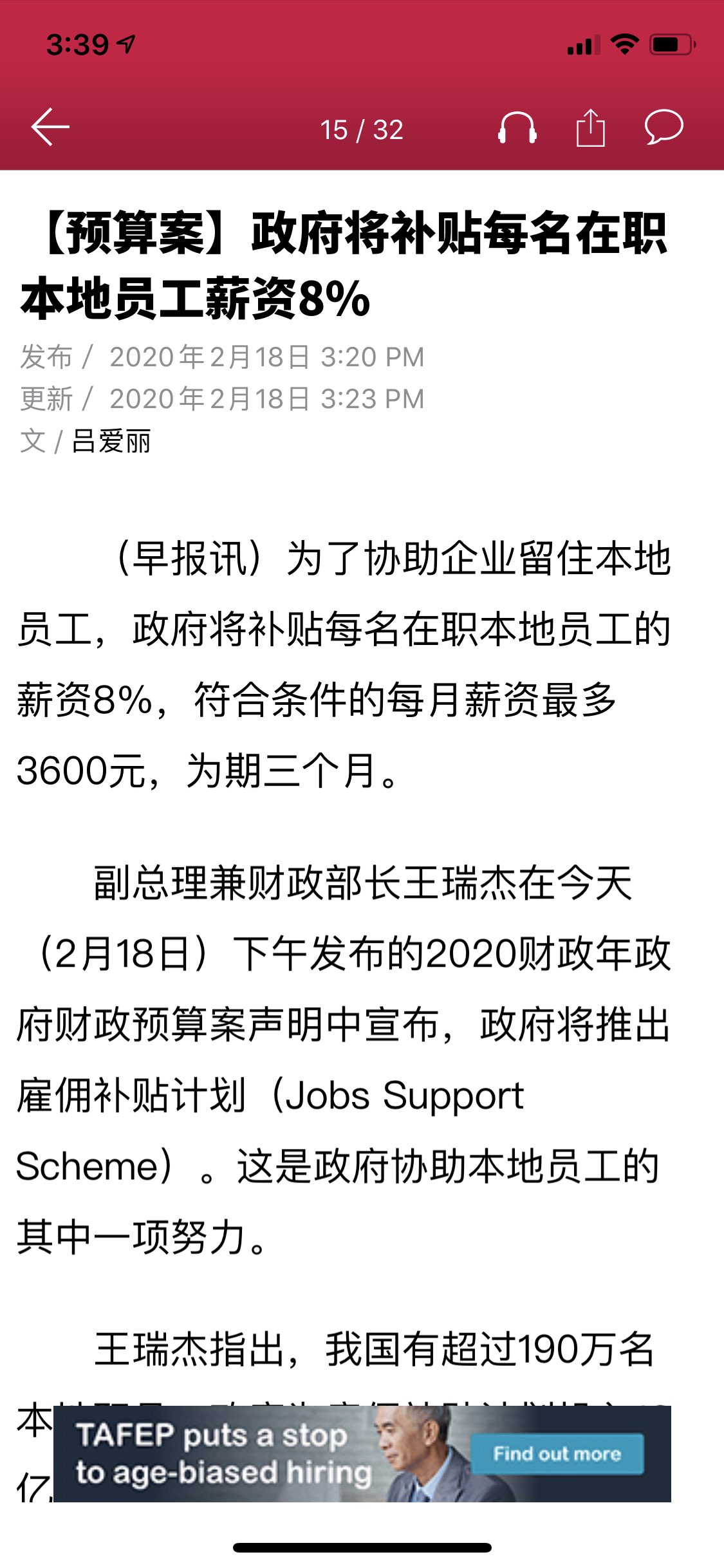 政府将通过雇佣补贴计划协助企业继续聘请本地工人。雇主每聘请一名本地工人,政府将承担8%的工资,每月顶限为3600元,为期3个月。 -