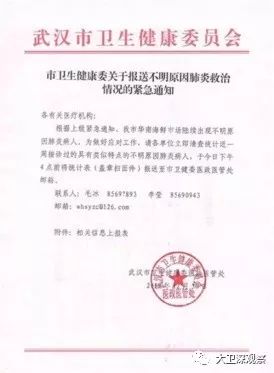 这场来势凶猛的大疫第一次闯入公众视野,是网络流传的一份武汉市卫健委内部通知,这份通知明确写道:“我市华南海鲜市场陆续出现不明原因肺炎病人”,并要求各医疗单位统计类似的不明原因肺炎病例上报卫健委医政医管处。