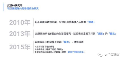 2003年萨斯疫情爆发后,石正丽曾带领团队在全国各地采集蝙蝠样本做病毒检测,并于2013年将成果发表于《自然》杂志上。2017年,石正丽团队确定SARS病毒是经过几个蝙蝠SARS样冠状病毒重组而来,一度引发普遍关注。