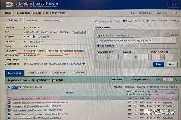 很快,有专家利用美国国立卫生研究院(NIH)生物科技信息中心(NCBI)的比对工具BLAST,对当局12日第三次提交的基因组序列进行基因比对,证实了张永振的发现。