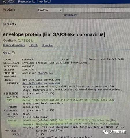 2020年1月21日,中国科学院上海巴斯德研究所分子病毒与免疫重点实验室研究人员在《中国科学 生命科学》(SCIENCE CHINA Life Sciences)上发表的一篇论文提到一个重要现象:武汉病毒的S蛋白一个关键部分的序列,和萨斯病毒具有高度同源性。