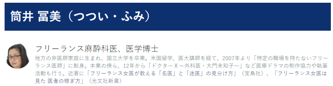 (筒井富美博士,曾协制过《doctor X》等医疗类日剧,出版多本医学著作)