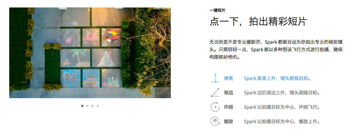 并且,这一次大疆还为 Spark 配备了“一键短片”功能,自带的四种飞行模式能够拍出更具专业性的视频画面,并且还能直接在手机 app 中简单制作成 10 秒短视频分享,即使你不会用无人机也能拍出更具有“大片感”的画面出来。