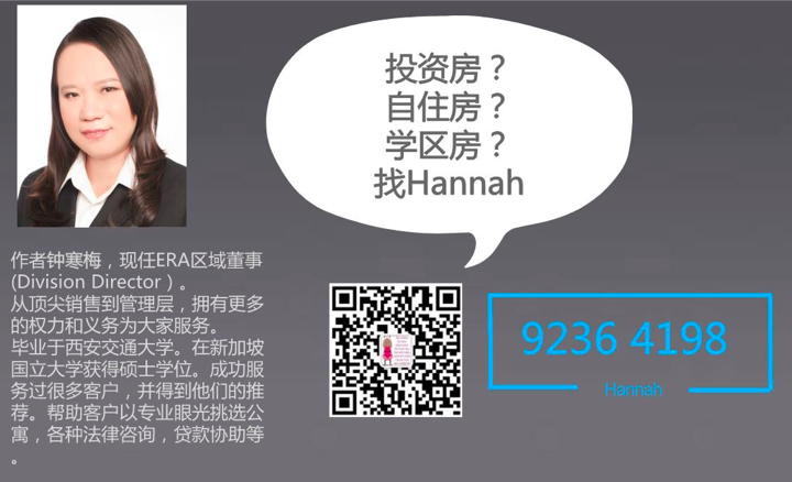 华新市场部 • • 14969 次浏览个人介绍: 作者钟寒梅,现在职位是ERA区域总监。毕业于西安交通大学。在新加坡国立大学获得硕士学位。目前是ERA的专职营销经纪,成功服务过很多客户,并得到他们的推荐。主要帮助客户以专业眼光挑选公寓,各种法律咨询,贷款协助等。
