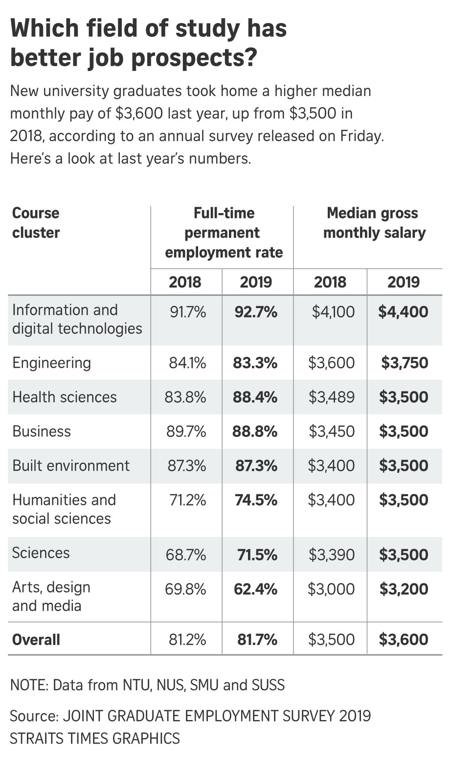 The survey polled 11,400 fresh graduates from full-time programmes at the National University of Singapore (NUS), Nanyang Technological University (NTU), Singapore Management University (SMU) and Singapore University of Social Sciences (SUSS).