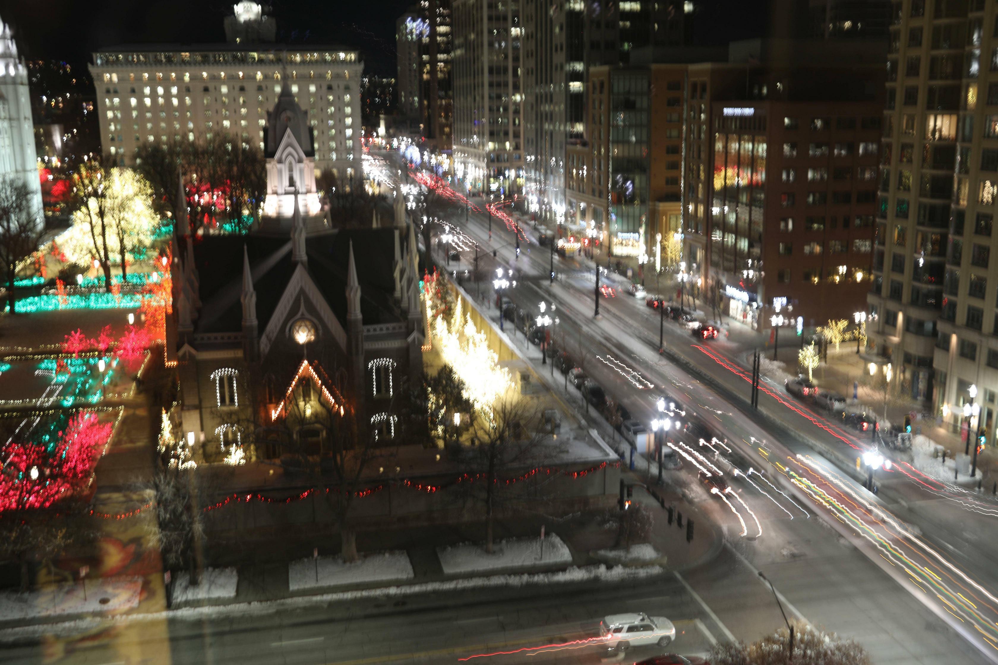 摩门教堂每年圣诞节和新年期间都在门前广场的装饰灯,几乎每一棵树都有灯光;外周来旅游的基本会到此处看看。车流是在旅馆楼道里隔着玻璃拍的。