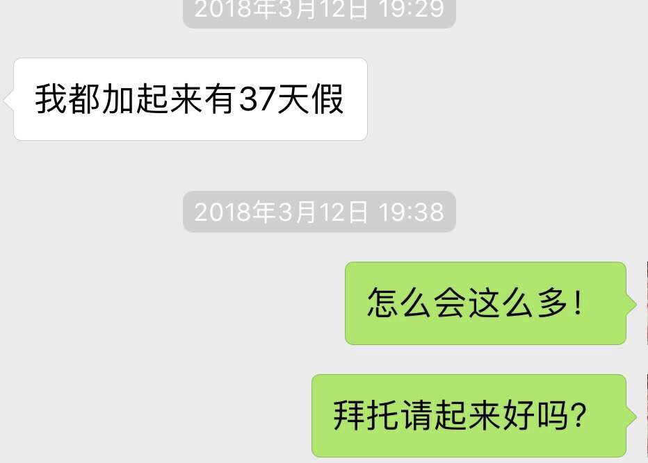 羡慕嫉妒恨,刚开工只有十四天,加娃的六天但去年一年只休了八天。六天在年底那两个礼拜。。。