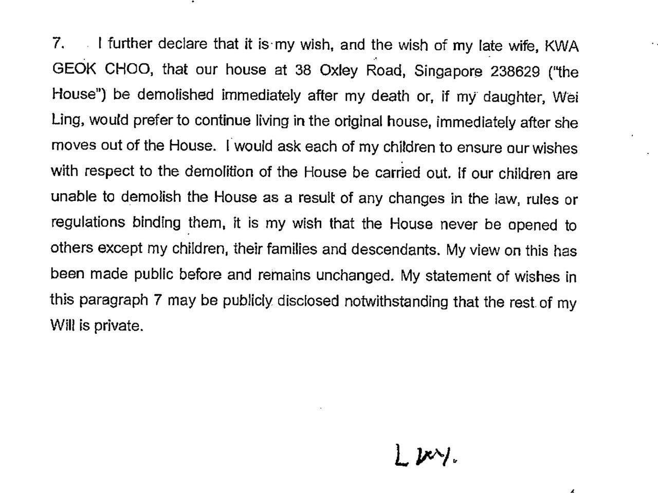 5. The Demolition Clause in the Last Will is now being used by Dr Lee Wei Ling ("LWL") and Mr Lee Hsien Yang ("LHY") to claim that Mr Lee was firm in his wish that the house at 38 Oxley Road (the "House") be demolished, and that he was not prepared to accept its preservation or contemplate options short of demolition. There is no basis for these claims, not least because of the deeply troubling circumstances concerning the making of the Last Will.