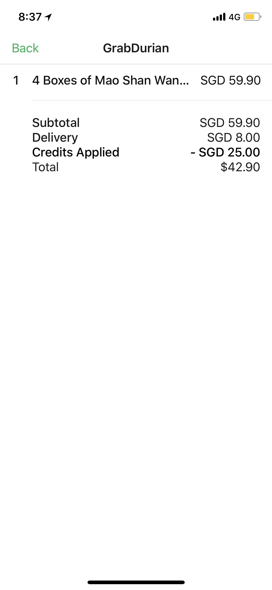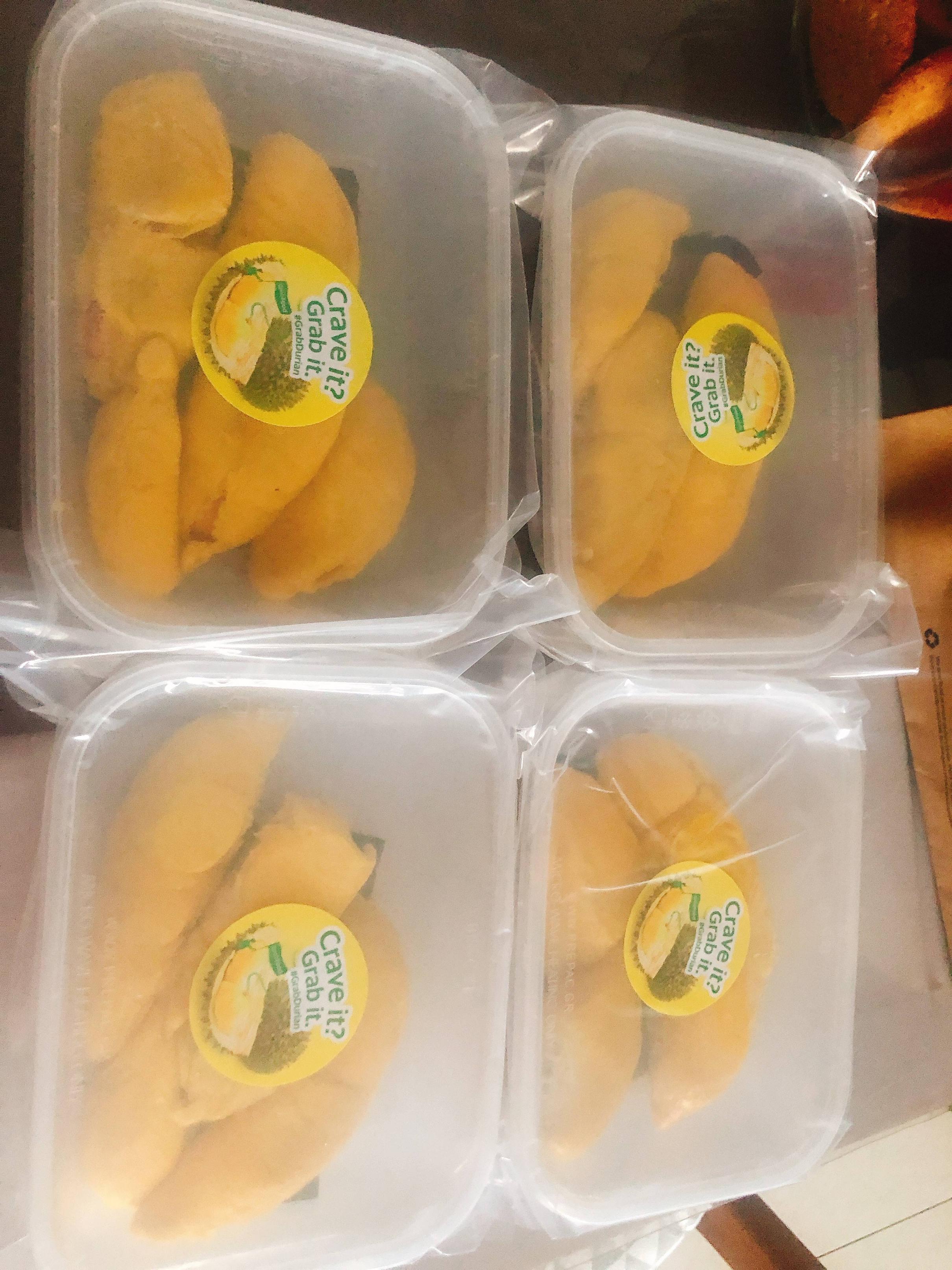 蹲了好几天,今天930终于蹲到,火速下单grabdurian。榴莲本身55,比正常贵5块我忍了,delivery fee 十块我也忍了(地址送去outram这种繁华热闹从哪儿过去都不远的地方)