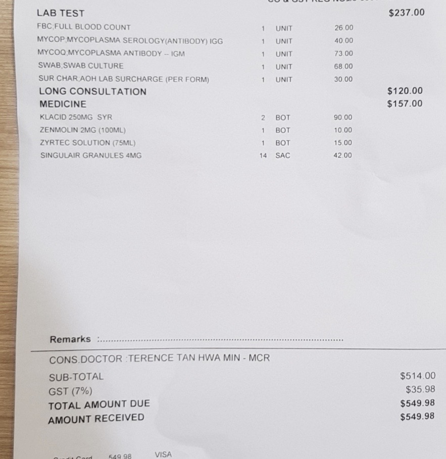 Mount A的Dr Tan Hwa Min Terence这次化验也是根据孩子的情况做的,不过他一直很忙,等的时间会比较久,我们一般都是早上诊所开门的时候去registration, 然后回家等打电话叫