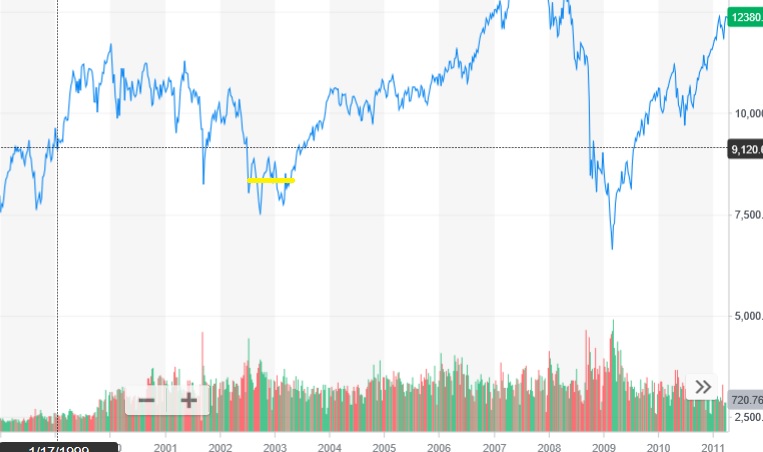 如果认为8000为2008的底这个底筑了一年 (从2008.6-2009.6) 期间还有6500的深沟