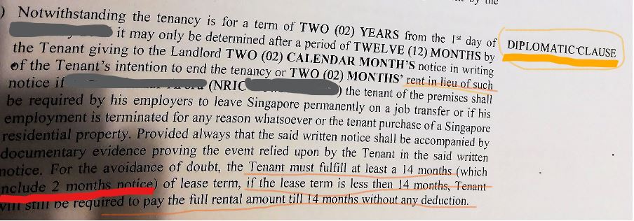 下面Diplomatic Clause, 是两年内的lease, 至少住满14个月,14个月以后可以因买房或换工作等原因搬出,但提前2个月通知,至少付14个月房租。照片有阴影,拍照不方便,看看吧。