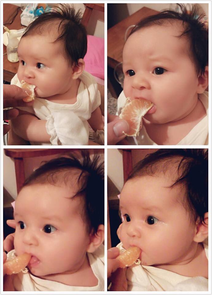 目测某爹是新手没经验,无知者无畏...小妞三个月大时亲爹就喂她橘子了,我也是后来才知道不能乱吃的...