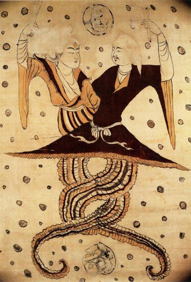 两种婚姻形式都可以从神话传说中找到踪迹,“感天受孕”体现杂婚制度;伏羲女娲兄妹结合,体现血缘婚制度。上图为伏羲女娲图,蛇尾象征交媾。女娲手执用于研究天象历法的“规”,一种说法称早期历法设立与女性经期有关;伏羲手执用于丈量土地的“尺”。