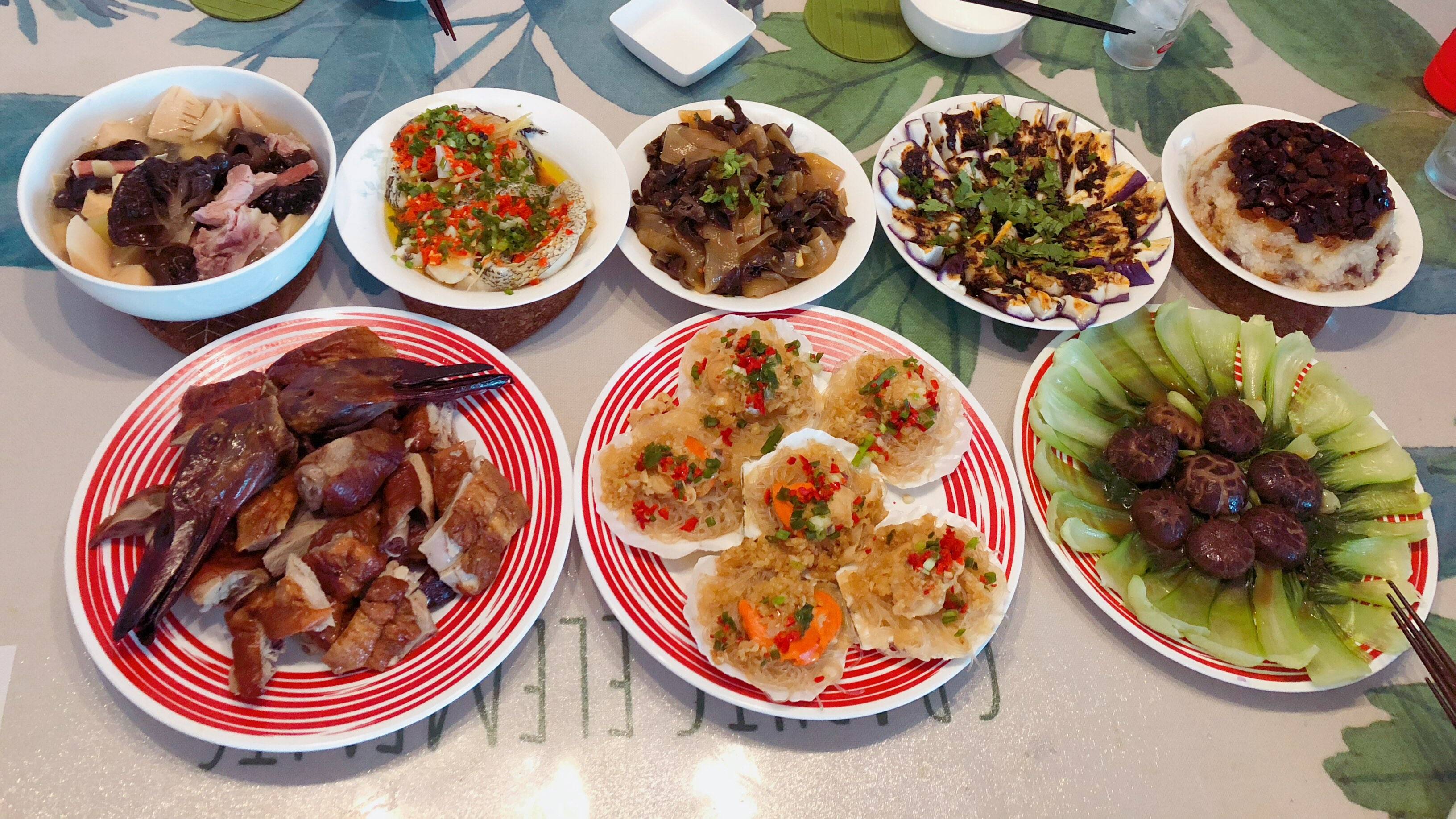 八个1)凉拌粉条2)蒜蓉扇贝粉丝3)十全烤鸭4)剁椒蒸鳕鱼5)豉汁蒸茄条6)香菇扒油菜7)腌笃鲜 8)豆沙红枣糯米饭