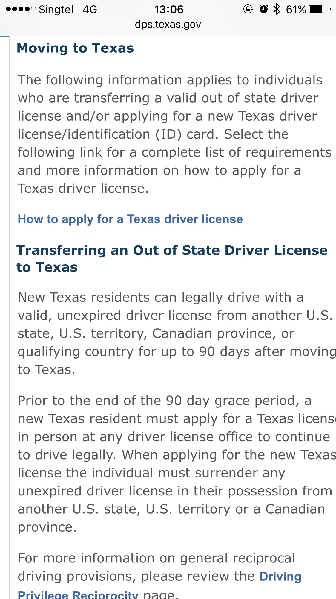 我的理解是新加坡驾照可以在德州合法开1年。有协议。但最好尽快申请德州驾照,因为这就是美国版的身份证。