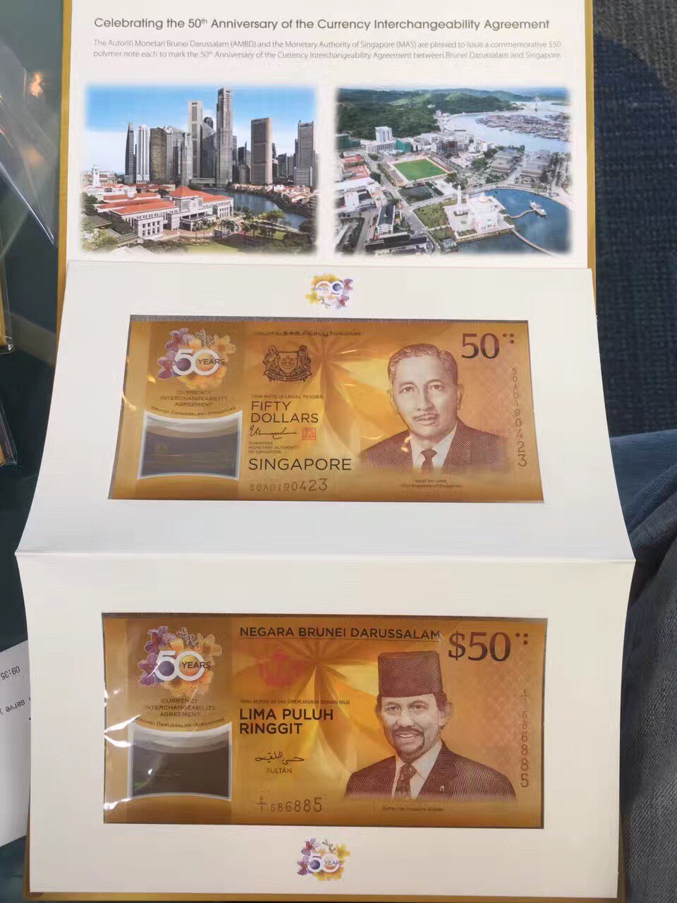 DengWei • • 38111 次浏览今年是新加坡和文莱之间签订货币等值互换的50周年,为了庆祝这个特别的两国友谊里程碑,新文两国共同设计了一套50周年限量纪念钞!