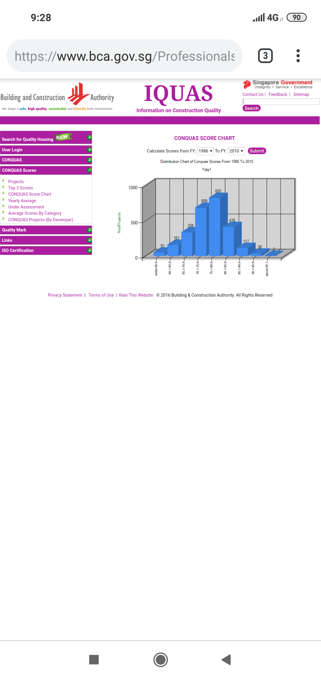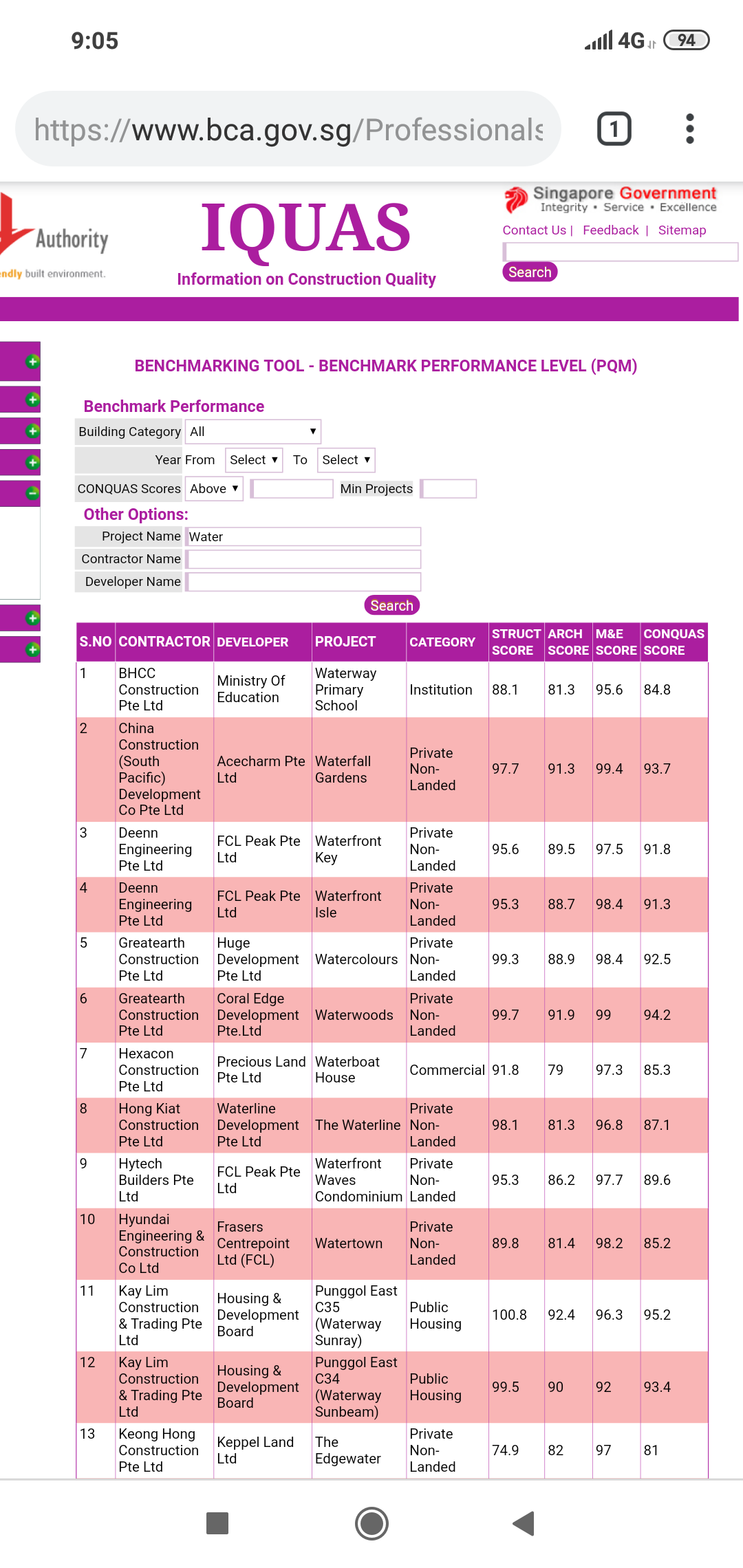 BCA对每幢住宅验收的时候都会对质量打分,叫做Conquas Score. 满分100分,分数越高越好。 大家可以比较一下,住宅类型里有写是私宅还是HDB。 下面是我用关键字water搜索的部分结果。