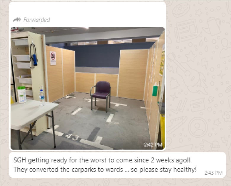 读者告诉8视界新闻,他通过短信接获友人转发的照片和信息指称, 新加坡中央医院将停车场改装成病房,为应付2019冠状病毒最糟情况做准备。短信也警告收信人呆在家中。