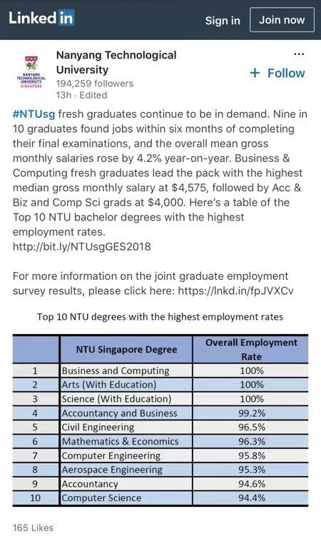 NTU前十大就业率最高的专业,computing相关的就占三个,WOW~