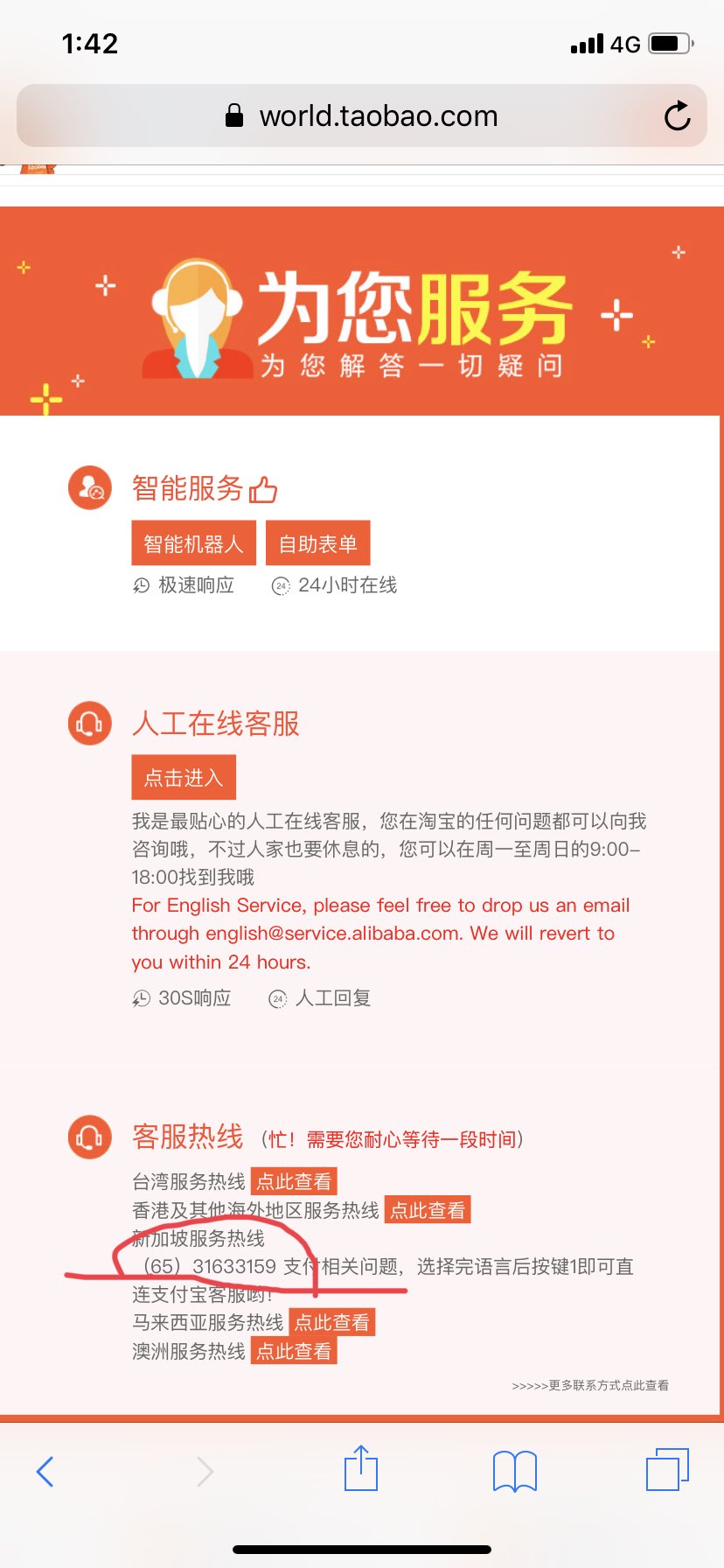 妹子你Google搜淘宝新加坡客服出来的第一个点开就有联系方式......