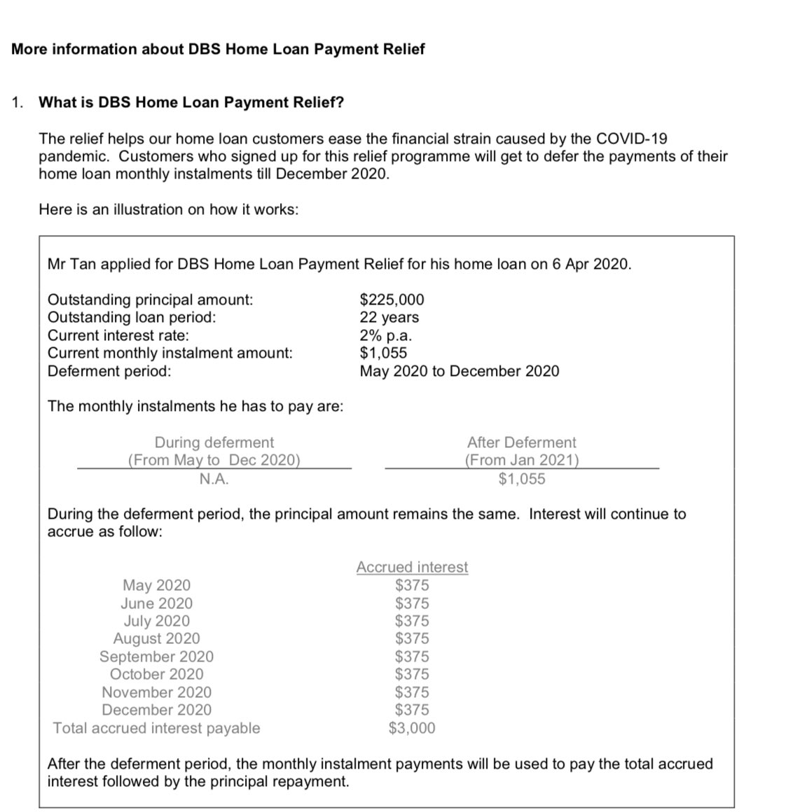 这个是dbs的没看懂tenure怎么算。比如我还剩一年的房贷,每个月房贷1000。如果defer的话,我从5月到12月不用付钱,那明年我继续每个月付1000到什么时候?今年defer这8个月的利息什么时候付?
