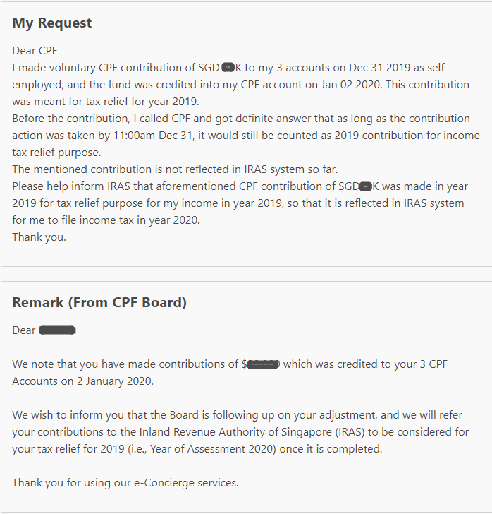 我也是怀疑就算我不给 CPF 写信要求,最终 IRAS 也是会算作 2019 年的扣税项目因为当初填补前打给 CPF,那边说只要当天操作就可以。并没有说还要回头联系他们做修改。