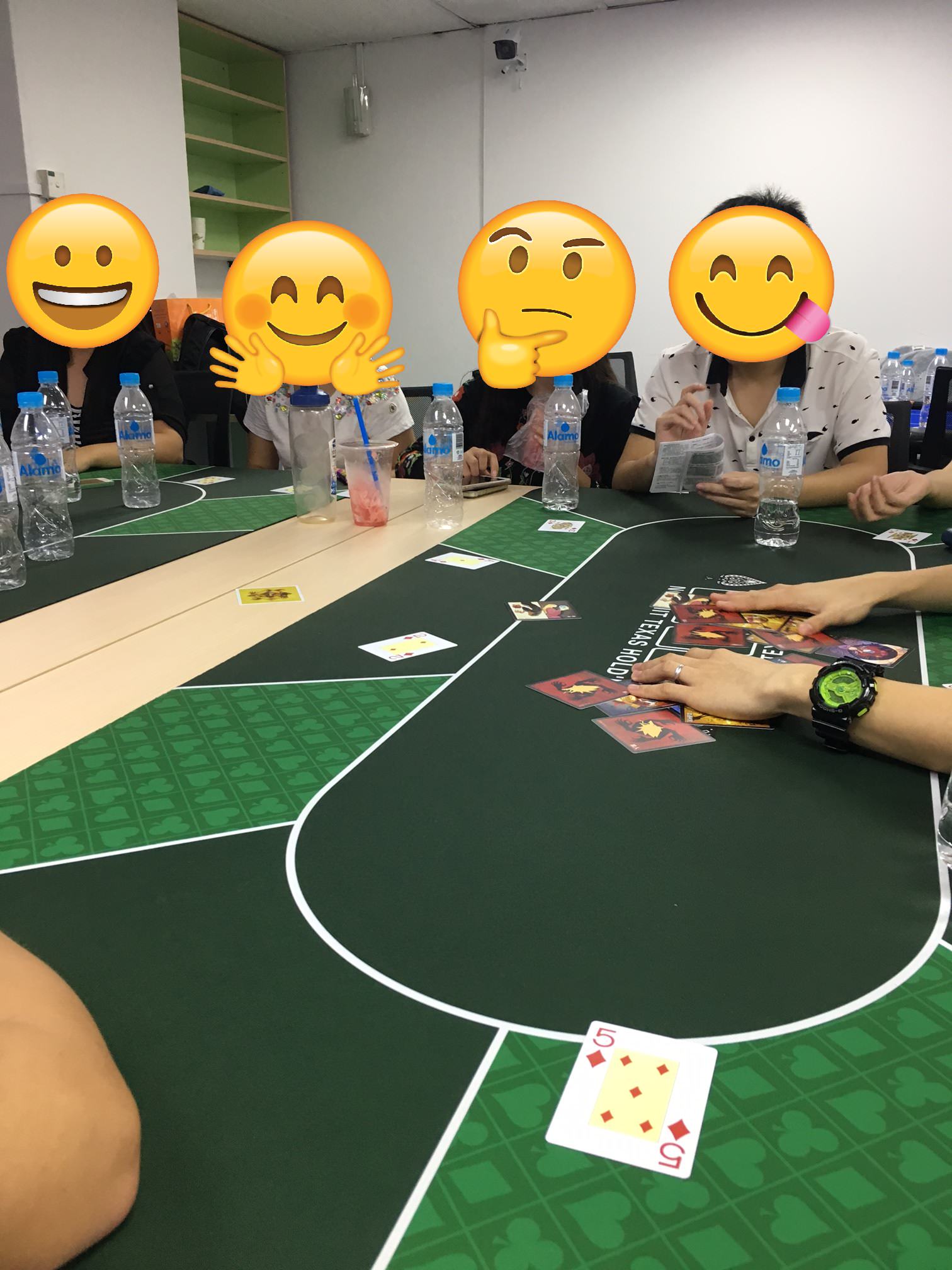 相比较之下我们旁边的德州桌完全玩的就是老年人的游戏,除了几次我被河杀大家开心的鼓掌,其他时间都是特别平静。 我们这些老年人一致认为,国际大专辩论会的辩手的选拔几局狼人杀就搞定了。