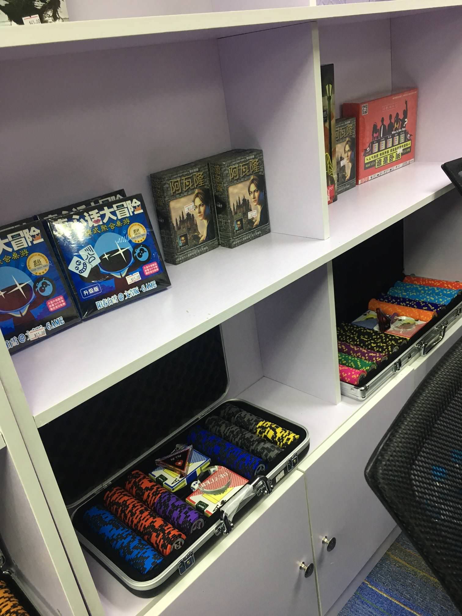 我们来到这家桌游俱乐部老板热情滴迎接了我们,虽然面积不大,但是德扑专用桌子首先映入我们眼帘,旁边的一堵墙上陈列各式各样的桌游,像狼人杀,三国杀,阿瓦隆,谁是卧底等热门桌游卡牌都是应有尽有,老板也是为了我们非常大方地拆了2副新的狼人杀牌给我们玩。